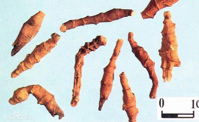 根茎呈短小纺锤形,略弯曲,长1-4cm,直径3-5mm。表面黄白色至棕色,具有多数环状突起的鳞叶痕,交互排列成节状,并可见细小的小根痕。质坚脆,易折断,断面平坦。类白色或黄白色,有粉性。气微、味淡而微酸。