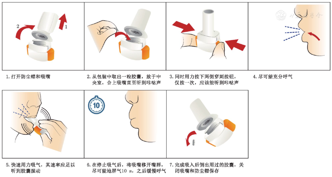 所有吸入装置通常在吸入后患者都需要屏气一段时间(10s左右),以利于药物在小气道沉降。对于屏气时间达不到10s的患者,可以在吸药前先进行几次深呼气后的深吸气或进行几次屏气的锻炼。