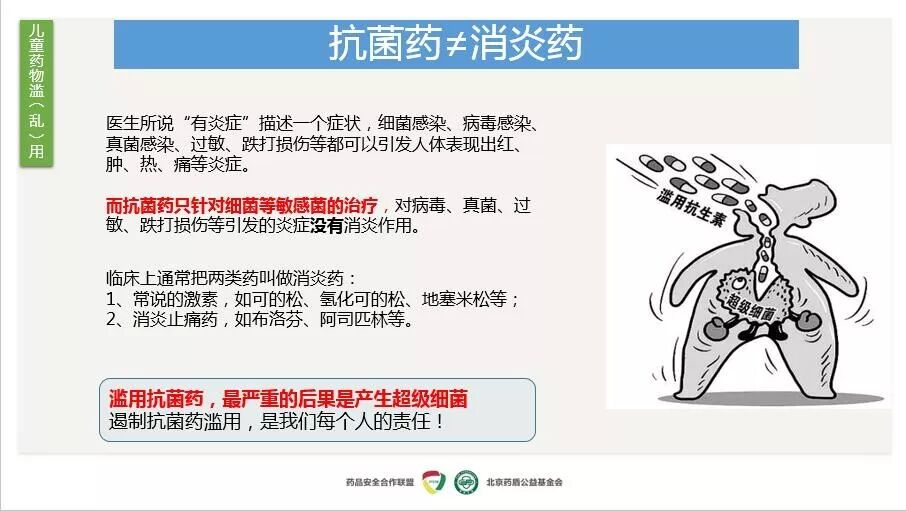 药师到幼儿园给家长普及合理用药的过程中,发现很多家长对于消炎药和抗生素傻傻分不清。 有的家长问: “布洛芬有消炎作用,那在使用布洛芬的情况下,还使用了头孢类药物,是否都是消炎作用?” 还有的家长问: “头孢是抗生素,它和我们常说的消炎药有什么区别?怎么区分?” 遇到这些问题,我都会告诉他们:您混淆了消炎药和抗生素。严格地说,消炎药和抗生素不是一个概念,不应混为一谈。而这个基本概念,被家长们普遍混淆,就连药师自己的家人,也有一半人不清楚。所以,有必要反复强调,反复科普,帮助大家提升对药品的常识知识。 首先,我们要了解炎症的概念 炎症的局部反应包括红、肿、热、痛及功能障碍;发热及末梢血中性粒细胞升高是炎症的全身反应。 炎症不是特定的一种疾病,而是很多疾病都会表现出来的一种症状炎症,可以是感染引起的感染性炎症,也可以不是由于感染引起的非感染性炎症。 细菌、病毒和真菌可以引起炎症,但进入人体的异物如金属、坏死的组织、烧伤等也会引起炎症。 医学所说的抗炎药物主要包括非甾体类抗炎药如布洛芬、糖皮质激素如泼尼松、H1受体拮抗药等,这些抗炎药主要是对症治疗,可以消除充血、水肿等炎症反应。 那么,抗生素又是怎么回事呢? 抗生素是用来杀死细菌等微生物的,属于对因治疗,但对病毒如流感病毒、疱疹病毒等都是无效的。 小结一下: 由细菌如金黄色葡萄球菌,或者非典型病原菌如支原体等感染引起的炎症,使用抗生素是有效的; 病毒等感染引起的炎症使用抗生素是无效的; 对于不是由于感染引起的炎症如进入人体的异物、烧伤等导致的炎症,使用抗生素更是发挥不了任何作用。 那有的家长会问在日常生活中我们如何判断药物是否是抗生素? 这些药物名字医生药师们都烂熟于心,但宝妈宝爸们可能听着一脸蒙圈。现在,给大家介绍一个简单粗暴、能快速判断的办法: 名字中含有西林、头孢、霉素的药物,大部分都属于抗生素。 拿到不了解的药品,想判断是不是抗生素,还有另外一个办法: 取出药品说明书,在【适应症】项下,如果是抗生素,会有这样的语言描述:“本品适用于敏感菌引起的下列感染……”紧接着会提到具体感染部位、疾病名称、具体感染菌种类等。这类语句,基本上可以判定是宝妈们所说的抗生素了。 为什么要强调消炎药和抗生素的区别呢? 就是怕家长分不清两者的概念,导致滥用抗生素。很多家长就是把阿莫西林、头孢、阿奇霉素等等的抗生素当成包治百病的消炎药,当孩子出现嗓子疼、发热等情况时,都认为是炎症,并未到医院检查判断是否是由细菌感染引起的炎症便自行服用抗生素,滥用了抗生素也不知情。 而滥用抗生素直接危害就是耐药问题。抗生素和消炎药不是一回事哦! 审核专家:安徽医科大学第三附属医院 秦侃