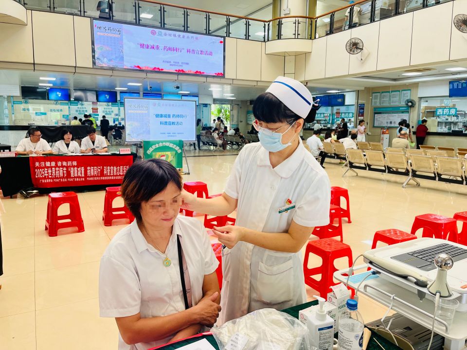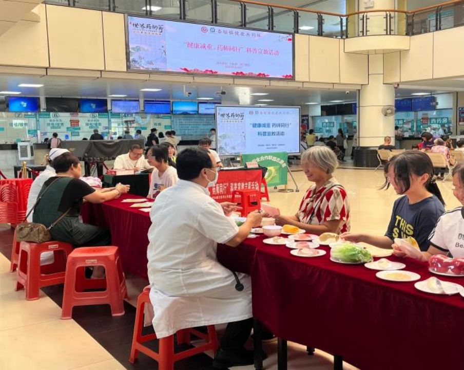9月29日,活动以“药师主导 + 多学科协作” 模式展开,工作站联合内分泌科、中医科、药剂科、临床药学等多学科团队,在医院门诊大厅举办“健康减重,药师同行”公益科普活动。活动设置科普讲座、专家咨询、特色体验区(中医适宜技术体验与减脂餐展示)三大区域,为群众提供从代谢评估、体质调理到合理用药的“一站式”健康管理服务。药师团队全程参与指导,强化用药安全,彰显药学服务的深度与温度。同时,解决了传统科普 “只讲知识、不解决实际问题” 的痛点,例如为肥胖合并高血压患者同步调整用药方案与减重计划,既保障用药安全,又提升减重效果,避免 “减重影响血压控制” 的风险。
