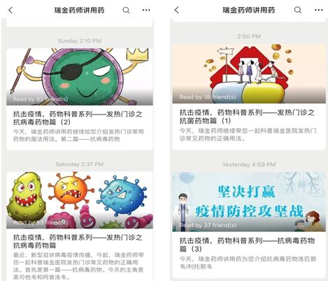 随着疫情的发展,种种谣言也是层出不穷,“宅”在家里的民众们也承受着越来越大的心理压力。瑞金医院药剂科选择用药学科普的形式,陪伴广大民众一路前行,自2月1日起,我科的微信公众号“瑞金药师讲用药”调整了发布频率,由原本一周两次改为每天发布“抗击疫情——药学科普系列”,就发热门诊用药、抗击新冠肺炎用药、疫情最新进展等内容进行科普,用专业方式陪伴人民群众共同抗击疫情。 “瑞金药师讲用药”~来自瑞金的专业声音