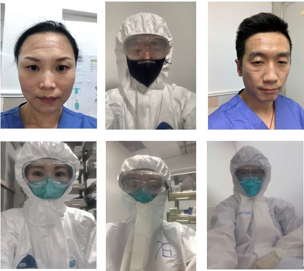 自1月21日发热门急诊确立常规工作以后,发热药房24小时工作制随即实行,药品目录也被迅速确定:常用药物包括口服剂30种(新增阿比多尔、连花清瘟)和23种注射剂。而药库、急诊药房更是为发热药房第一时间做好了药品供应、保障工作。尽管面临不小的人员缺口压力,药剂科各部门仍克服自身困难,科主任、支部书记、副主任、核心组带头,门诊、急诊、制剂分析室、临床药学、中心药房等各部门均紧急抽调人员加入“战斗”,保证了发热药房的正常运行。 发热药房的工作时间长、防护严、压力大、任务重。药师们为了保证工作、节约物资,尽量做到“三不”:不进食、不喝水、不去洗手间。药师们交接班时摘下口罩,脸上都留下了深深的勒痕,全身被汗水浸湿,但大家毫无怨言,一致认为这是2020年 “最美的妆容”。 瑞金医院药剂科发热药房药师的身影