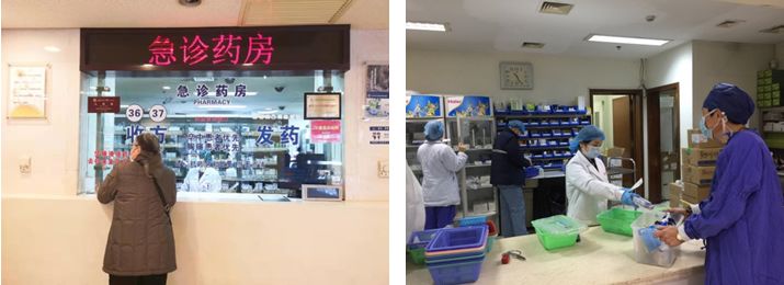 除了发热药房的一线防控工作,药剂科其它部门也井然有序地工作着,通过坚守岗位来参与这场没有硝烟的战争,是真真实实的写照。各部门加强工作区域的清洁消毒工作,做好个人防护,员工之间互相鼓励,互相支持,协调排班来支援发热药房的工作…… 如此种种,不胜枚举。事实上,瑞金医院药剂科的每一个员工都在自己的平凡岗位上为打赢这场“人民战争”做着不平凡的努力。 加强药房区域的清洁消毒 急诊药房 传肺药房PIVAS药师 病区药房药师