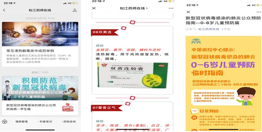 随着疫情的发展,感染人数及死亡人数的不断攀升,民众恐慌、焦躁的心理逐渐逼近极限,盲目相信并尝试网传的有效防疫药品及防疫手段。为帮助公众正确认识新冠肺炎、准确获取药品信息及有效的防疫知识,药剂科利用松江药师在线公众平台及时发布相关知识,为公众答疑解惑,缓解公众恐慌。